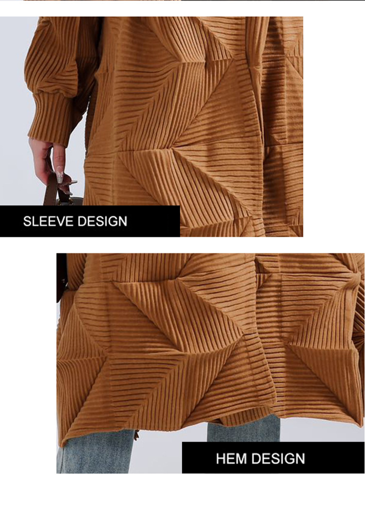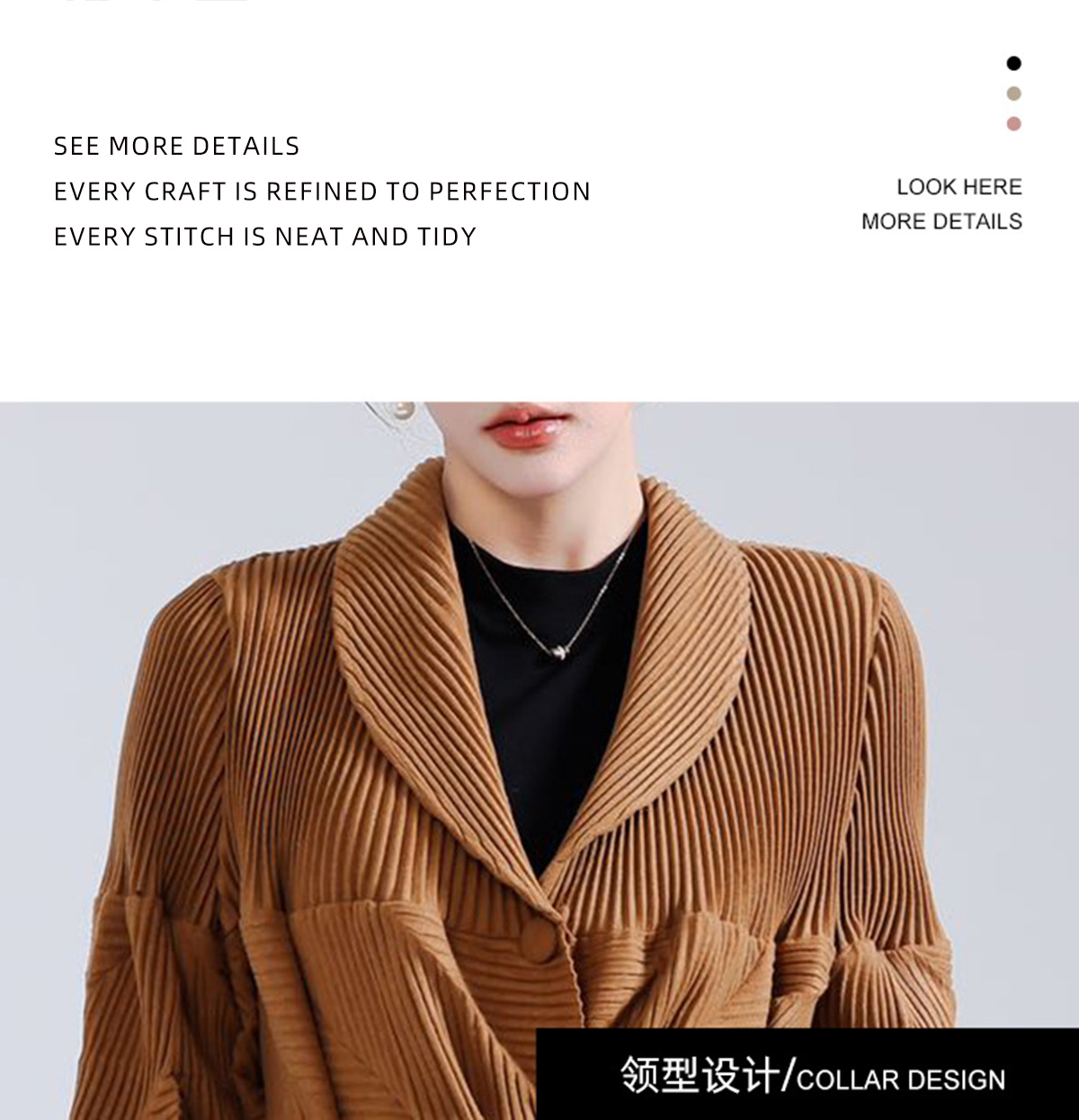 Made of thick woolen fabric for warmth and practicality, with gathered cuffs for a sharp look, it can be a style focal point in your wardrobe whether for sleek office styling or casual layering, speaking a unique pleat language that makes every outfit as surprising as an art creation.
