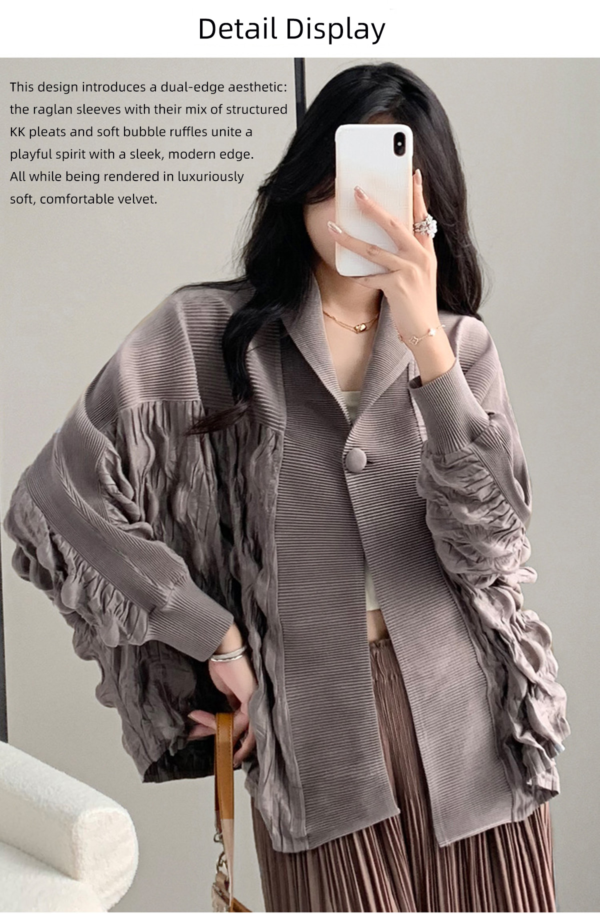 Women's Velvet Jacket with KK Pleats, Bubble Ruffled Sleeves, and Lapel Collar for Spring & Fall